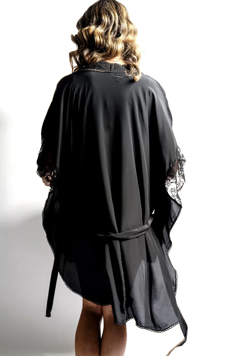 Drape yourself in timeless elegance with the Florence Short Kimono, crafted from luxurious black silk and delicate lace. This versatile layering piece seamlessly transitions from intimate moments to leisurely mornings, offering a refined silhouette that complements any lingerie collection. The soft, fluid fabric caresses the skin while the intricate lace detailing adds an understated touch of allure.